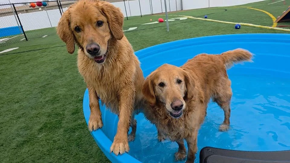 Our outdoor daycare yards are packed with enrichment — from a 20’x11’ giant dog playground and premium puppy play kits to swim-safe, 9' poly pools… and so much more!