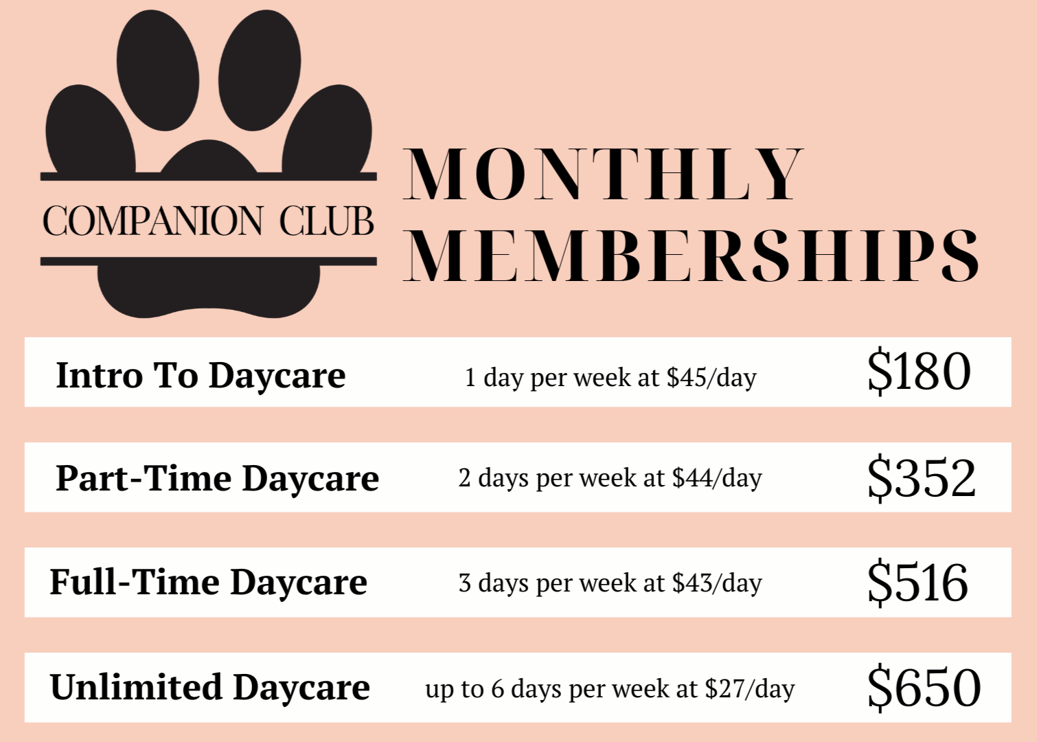 Daycare at the Companion Animal Center is offered through simple monthly memberships designed to support consistency and make planning easy. Memberships renew automatically each month, with included daycare credits available for use within that billing cycle; unused credits expire at the end of the month and do not carry over. Memberships may be canceled at any time before renewal, with no cancellation fees, no notice requirements, and no long-term commitments.